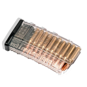 Рассчитан на 20 мест. Прозрачное исполнение позволяет контролировать кол-во оставшихся патронов. Кроме шероховатой поверхности, внешние стенки покрыты рисунком-протектором, не дающим магазину скользить в руках. Магазин легко разобрать. Утопив кнопку фиксатора тыльной крышки, вы можете легко снять ее и получить доступ для чистки и обслуживания.